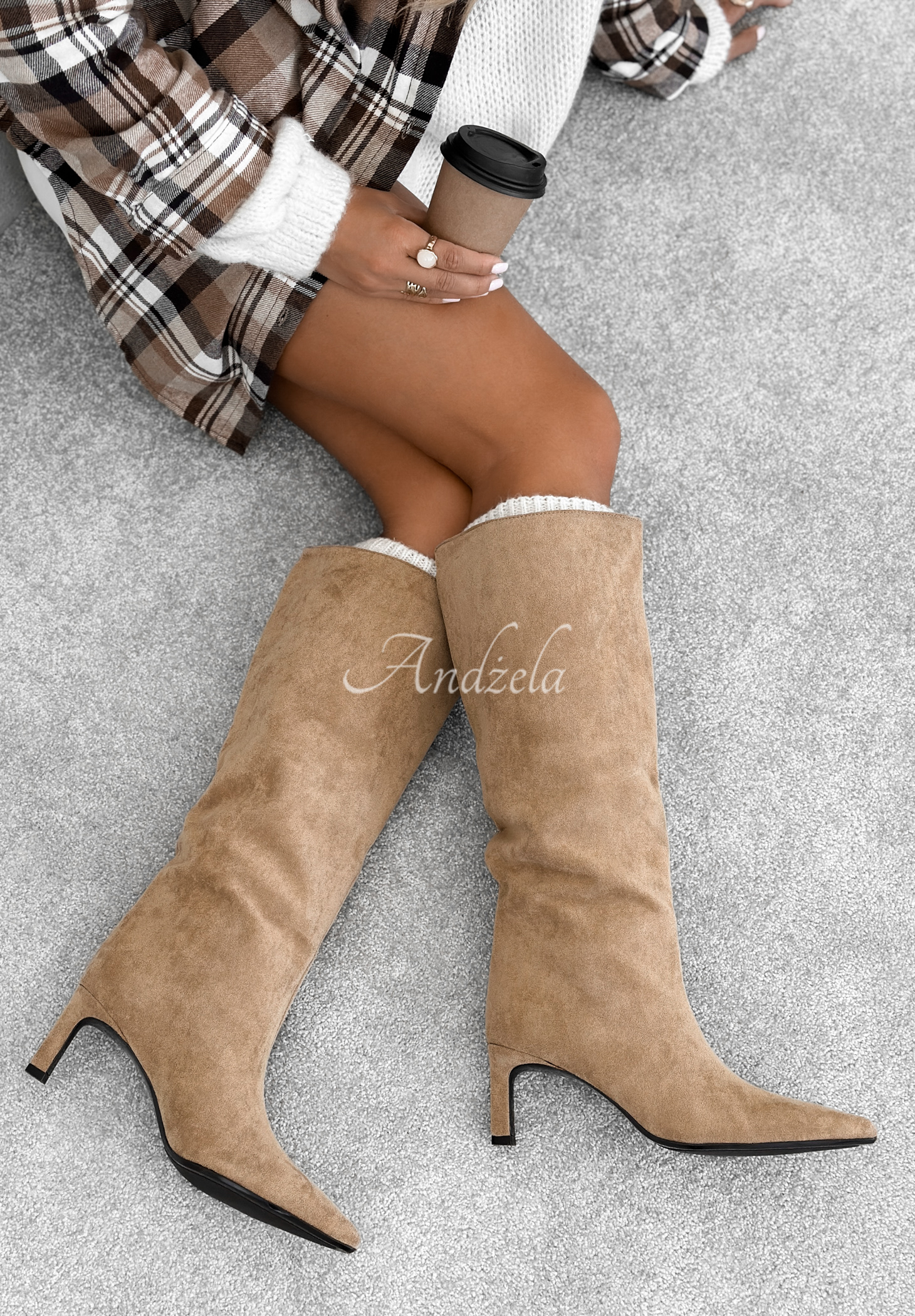 Diese Overknee-Stiefel sind aus weichem Wildleder gefertigt. Sie haben eine spitze Zehenpartie und einen schmalen Stilettoabsatz. Sie sind leicht gefüttert und haben keinen Verschluss.