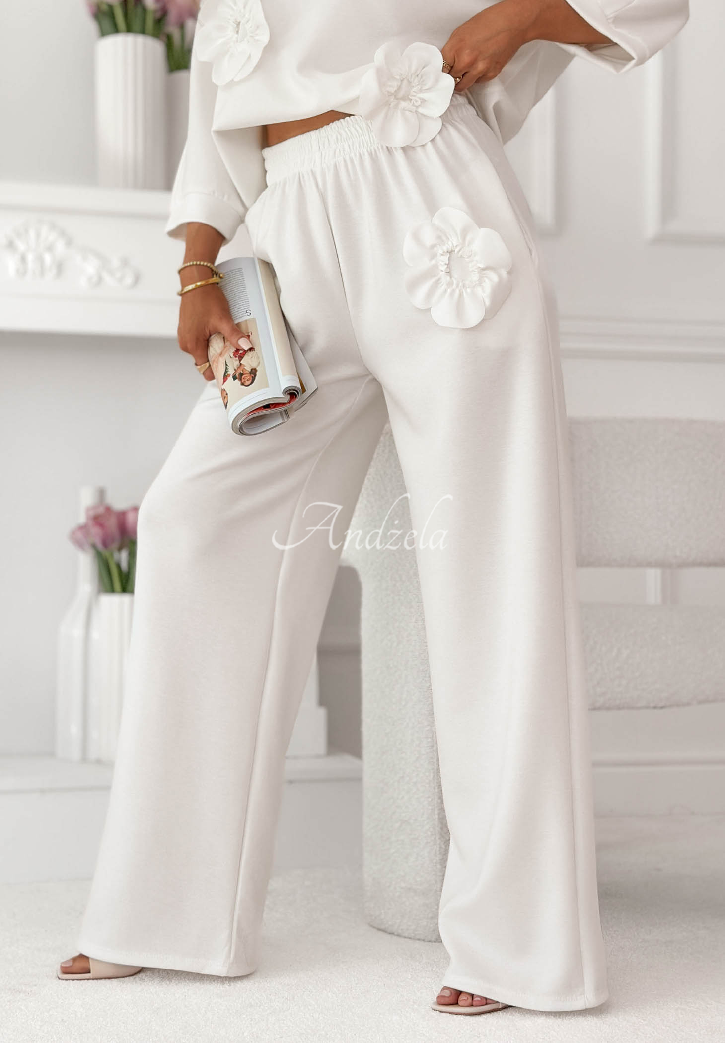 Dieser Trainingsanzug ist aus einem weichen, bequemen Stoff mit Viskoseanteil gefertigt. Er ist mit einer dekorativen Blumenapplikation verziert. Das Sweatshirt hat einen leicht oversized Schnitt und 3/4-Ärmel. Die Hose ist weit geschnitten, hat einen elastischen Bund und einen hohen Bund. Sie verfügt über zwei praktische Taschen.