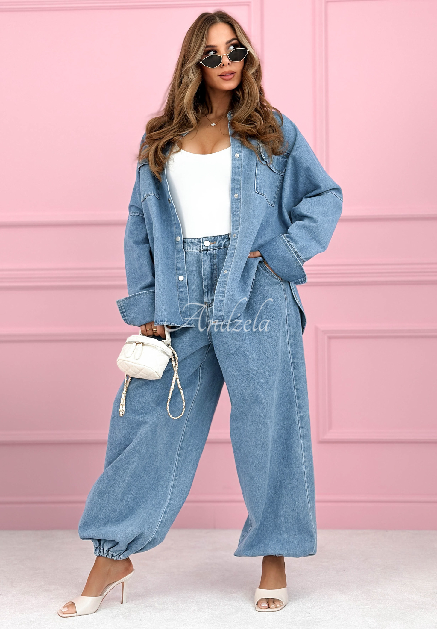 Ein sehr weit geschnittenes Jeans-Set aus hochwertigem Baumwollstoff. Das Hemd hat einen Kragen und Brusttaschen mit Druckknöpfen. Die hochgeschnittene Hose hat einen elastischen Bund hinten und Bündchen an den Beinabschlüssen.